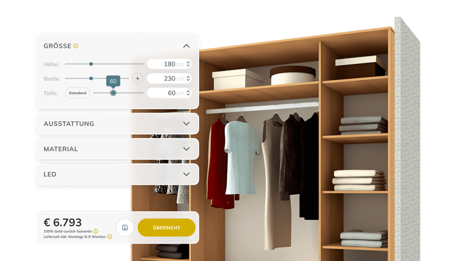 Для большинства мебельных компаний ответ очевиден: очень многое. Премиальные, сложные встроенные конструкции всегда требовали личных консультаций, индивидуальных чертежей и недель согласований. Но немецкая компания нашего клиента, специализирующаяся на элитных шкафах по индивидуальным размерам, решила изменить этот подход.